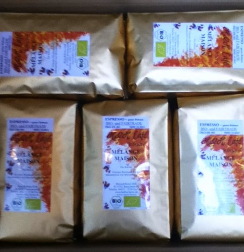 In eigener Rösterei veredelte frische 5 x 1 kg ganze BIO-FAIRTRADE Bohnen decoffeinierter Espresso & Café Crème MELANGÈ MAISON. ÖKO-DE-003