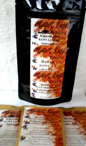 - GANZE BOHNEN! Die drei teuersten Kaffeebohnen-Raritäten der Welt im 3er-Geschenk-Set je 33,33 g pro Sorte. Alle drei Sorten jeweils getrennt im Alu-Beutel verschweißt und dann im Geschenk-Pouch verpackt. 100% PREMIUM-Katzen-Kaffeebohnen ungemahlen KOPI LUWAK IJEN aus INDONESIEN - NEUE ERNTE - frische mittelbraune Langzeitröstung in eigener Rösterei zu höchstem Aroma veredelt. Verpackt im Alu-Aromaschutz-Beutel je 33,33 Gramm, können auch ein paar g mehr sein, haltbar bis mind. 01.2015. Diese HIGHT QUALITY Luwak Kaffee-Rarität stammt aus einem staatlichen Betrieb, der eine eigene Zucht in dem Ort Bondowoso betreibt. Der Ort liegt in der Vulkanregion IJEN östlich von Java. Daher wird der Kaffee auch Kopi Luwak Ijen benannt. Diese Art der Schleichkatze befindet sich auch viel in den Urwäldern auf der Insel Sumatra und Bali. Jamaica Blue Mountain high Quality Bohnen ungemahlen der Wallenford Estate und die Kaffeebohnen ungemahlen Hawaii Kona extra fancy. Alle drei Sorten sind frisch in unserer eigenen Rösterei veredelt. MHD 02.2014.