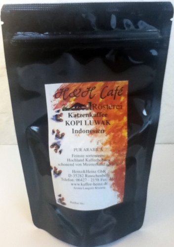 100% PREMIUM-Katzen-Kaffee fein gemahlen KOPI LUWAK aus INDONESIEN - NEUE ERNTE - frische mittelbraune Langzeitröstung in eigener Rösterei zu höchstem Aroma veredelt. Verpackt im Alu-Aromaschutz-Standbeutel mit Ventil wieder verschließbar je 120 Gramm, haltbar bis mind. 12.2016.